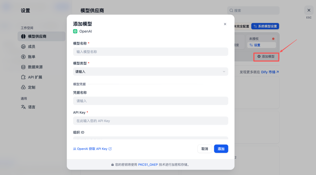 API 密钥配置正确后,「设置」按钮上方的指示灯将变为绿色。点击下方的「添加模型」按钮,所有可用的模型都将显示并可供访问。