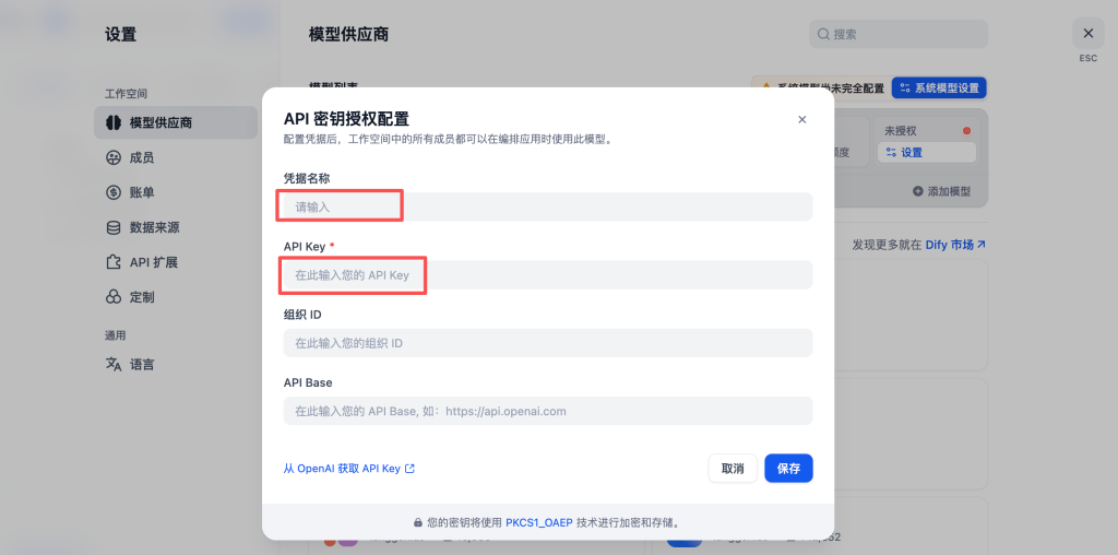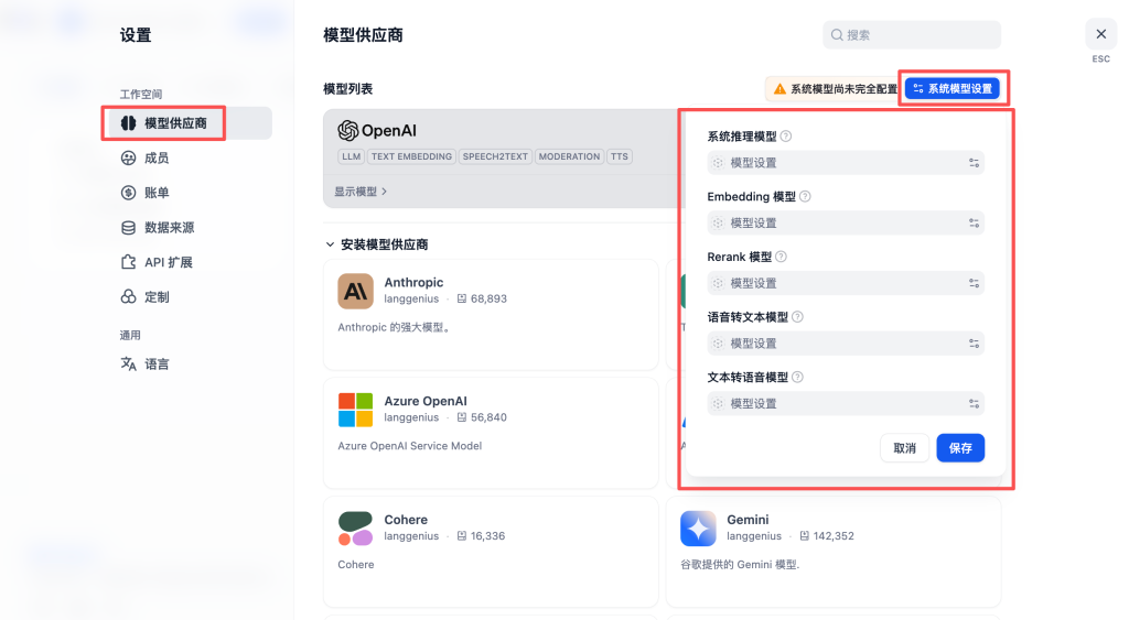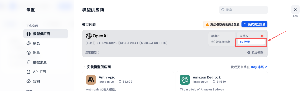 - 点击 OpenAI 部分右侧的「设置」按钮。