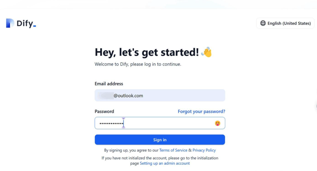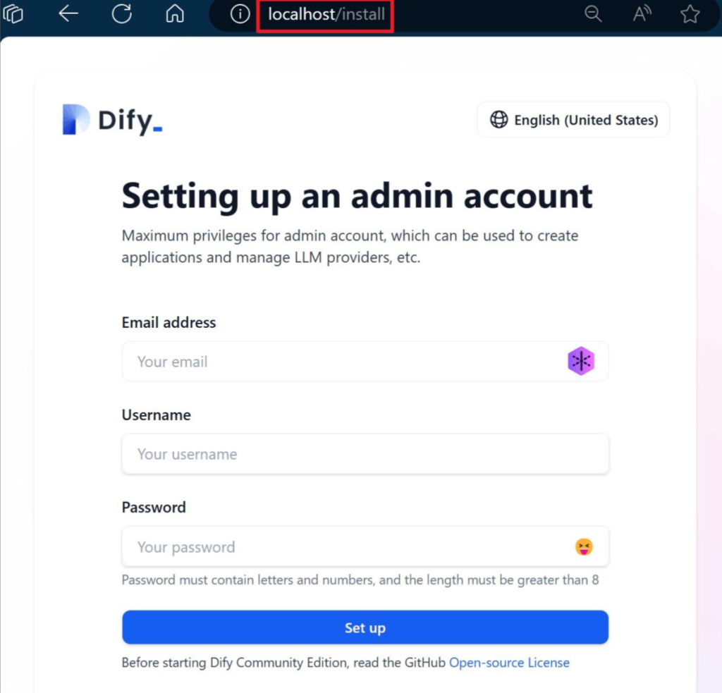 然后,打开浏览器并转到 http://localhost 以访问 Dify。输入必要的信息以完成用户注册。