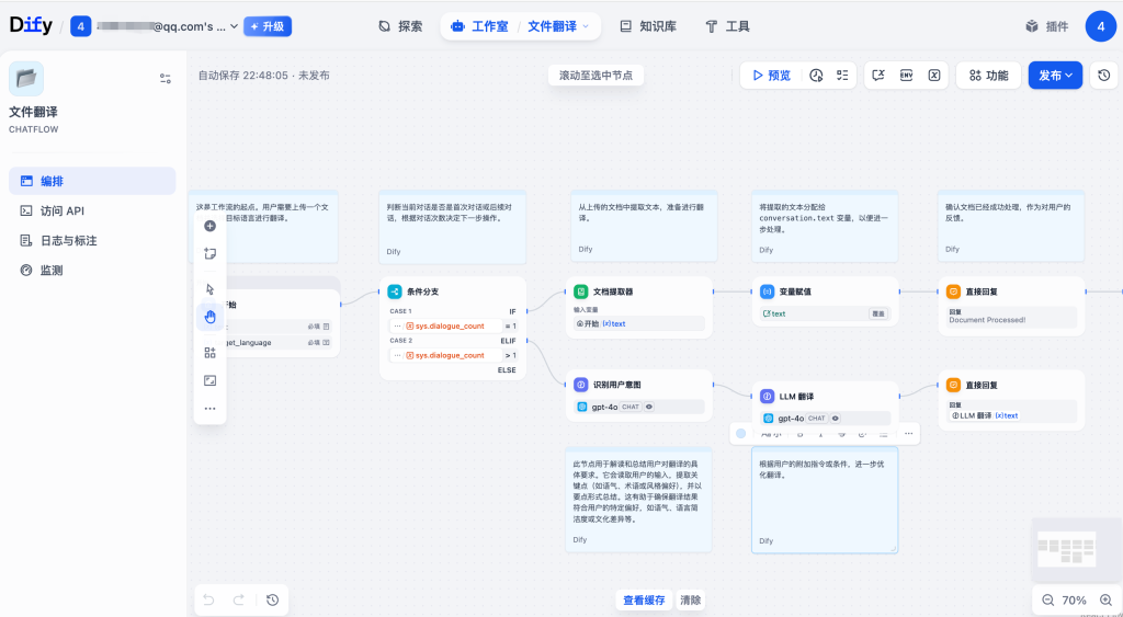 - 工作流:Dify 提供了一个可视化的画布来构建和测试强大的 AI 工作流。此功能使用户能够利用 Dify 的全部功能,包括模型集成和提示词设计。