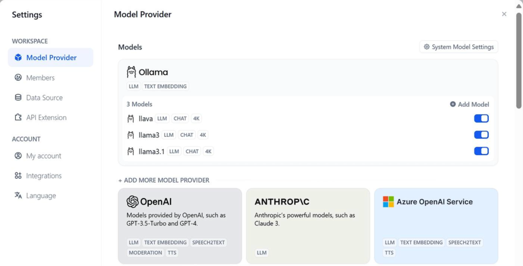 Dify 可以与本地模型或托管模型集成,例如 Ollama、LocalAI、Hugging Face、Replicate、Xinference 和 OpenLLM。