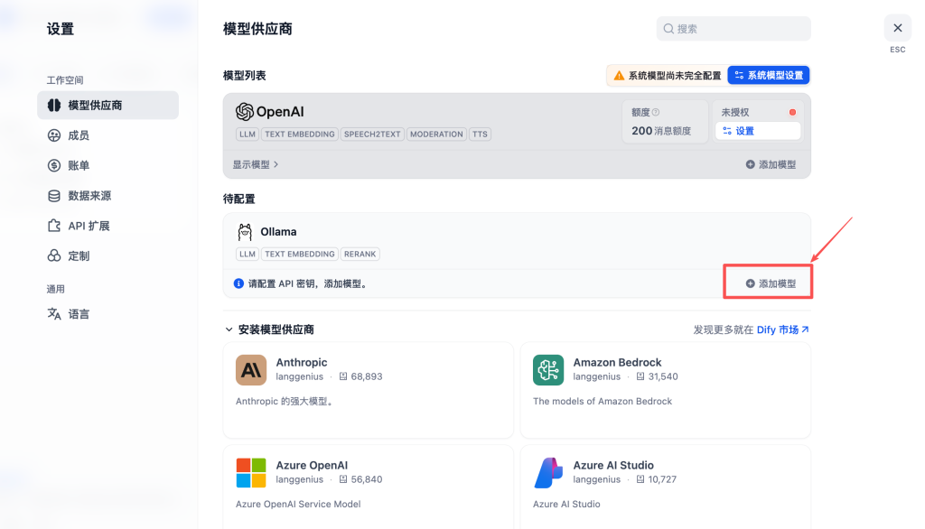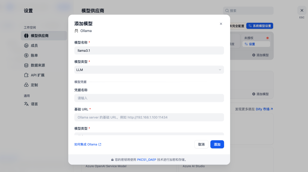 6、登录 Dify 后,导航到「设置 > 模型供应商 > Ollama」,并输入以下参数: